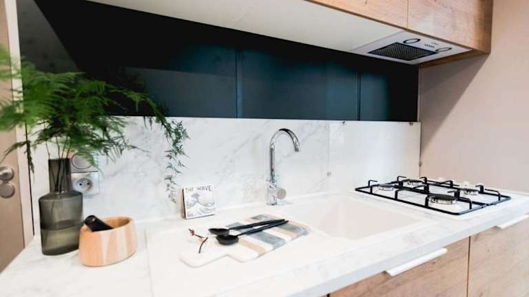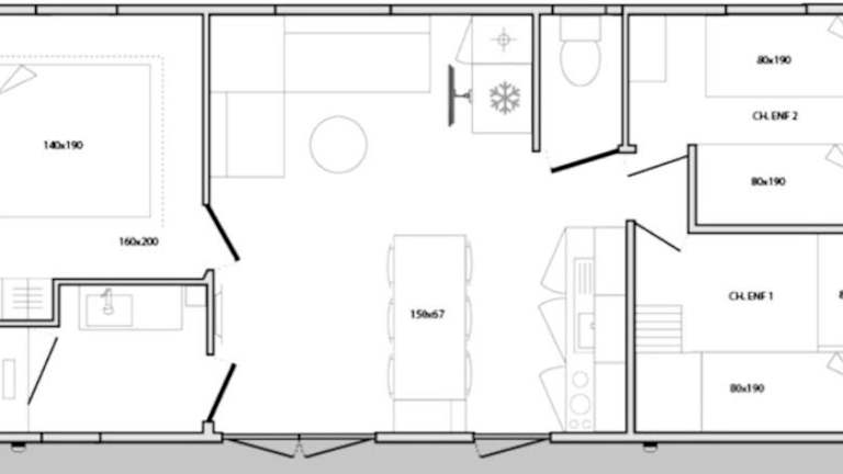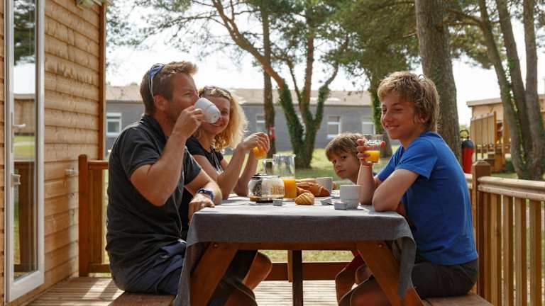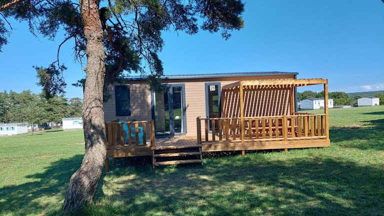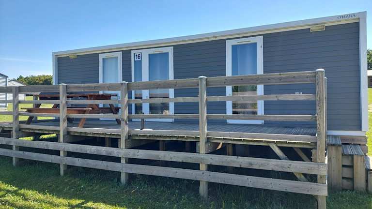 Die Mobilheime verfügen über eine Terrasse mit Gartenblick, einen Sitzbereich und ein Badezimmer mit Dusche. Eine Küchenzeile ist ausgestattet mit Kochfeld, Kühlschrank und Kaffeemaschine. Bettwäsche und Handtücher sind vorhanden.