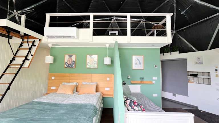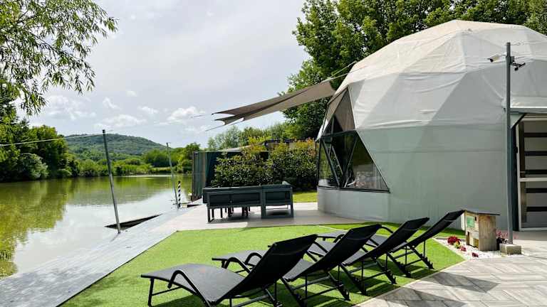 Die Unterkunft DOMEGLAMPING at FISHINGLAKE befindet sich in Ságvár und bietet Aussicht auf den nahegelegenen See. Die Umgebung lädt zum Velofahren und Erholen in der Natur ein.