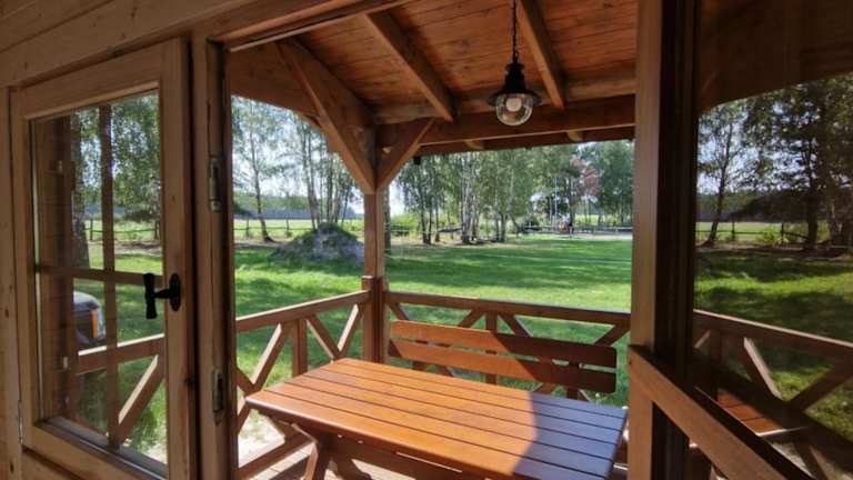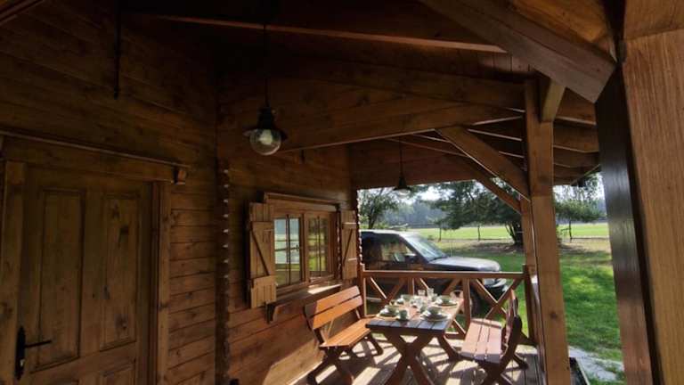 Domek Sarnówka bietet eine Terrasse mit herrlichem Gartenblick. Das Ferienhaus ist umgeben von einer ruhigen Landschaft und ermöglicht den Gästen entspannte Ferien.