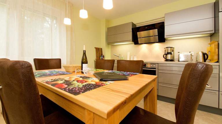 Die Ferienwohnung umfasst ein Schlafzimmer und eine voll ausgestattete Küchenzeile mit Kühlschrank, Geschirrspüler, Waschmaschine, Ofen und Toaster. Handtücher und Bettwäsche werden bereitgestellt. Ein Flachbild-TV ist ebenfalls vorhanden.