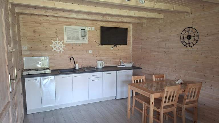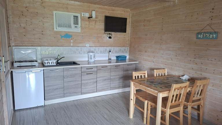 Die Unterkünfte verfügen über eine voll ausgestattete Küchenzeile mit Kühlschrank und Kaffeemaschine sowie über einen Essbereich.