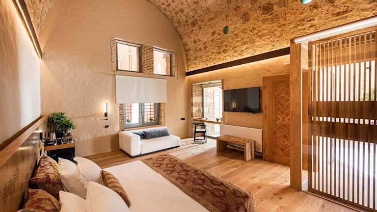 Das Domus Renier Boutique Hotel befindet sich im Herzen von Chania, nur 100 Meter vom Schifffahrtsmuseum entfernt. Es bietet einen Blick auf den alten Hafen und den Leuchtturm, umgeben von einer lebendigen Umgebung, die reich an Geschichte und Kultur ist.