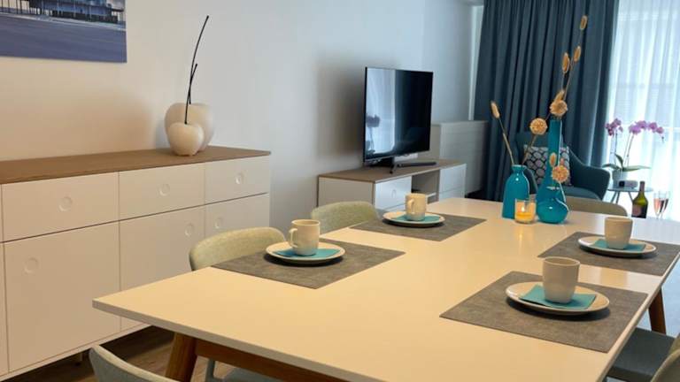 Die Ferienwohnung verfügt über zwei Schlafzimmer, ein Wohnzimmer mit Flachbild-TV sowie eine gut ausgestattete Küche mit Kühlschrank und Geschirrspüler. Sie beinhaltet ein Badezimmer mit Dusche und bietet einen Balkon mit Meerblick. Auf Anfrage sind Handtücher und Bettwäsche gegen Aufpreis erhältlich.
