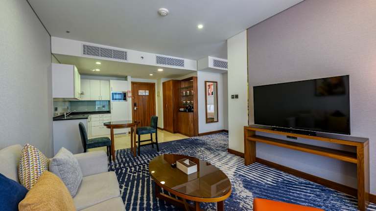 CI freundlich, Suite im 14. OG, 71 m2 gross. Bodentiefe Fenster, Blick auf die Mall daneben. Wozi mit Esstisch und Küchenzeile, WC, je ein TV in beiden Räumen. Grosses Bad mit Wanne und Dusche. Sehr gutes Bett. Nespressomaschine, zwischen 2 und 6 Kapseln pro Tag. Wasser Frühstück mit guter Auswahl und Qualität. Personal sehr freundlich im ganzen Haus.