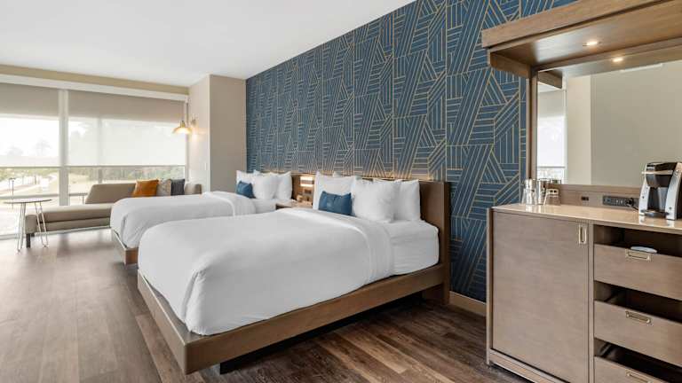 Die Zimmer sind mit einer Klimaanlage, Heizung, einem Kingsizebett sowie einem Sofabett ausgestattet. Jedes Zimmer bietet zudem einen Kühlschrank, eine Minibar, einen Schreibtisch und eine Tee-/Kaffeemaschine. Die Badezimmer verfügen über eine Dusche und sind mit Kosmetikartikeln sowie einer Auswahl an Handtüchern ausgestattet. Es sind auch rollstuhlgerechte Zimmer verfügbar.