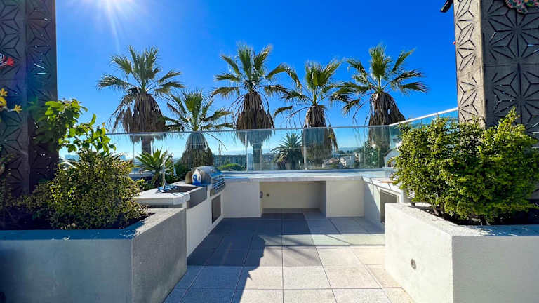 Downtown Los Angeles Skyline balcony view Modern Penthouse bietet klimatisierte Übernachtungsmöglichkeiten in einem modernen Penthouse mit Balkon und Blick auf die Skyline. Dieses Hotel gewährt seinen Gästen Zugang zu einem Fitnesscenter und einem Garten sowie einer Sauna.