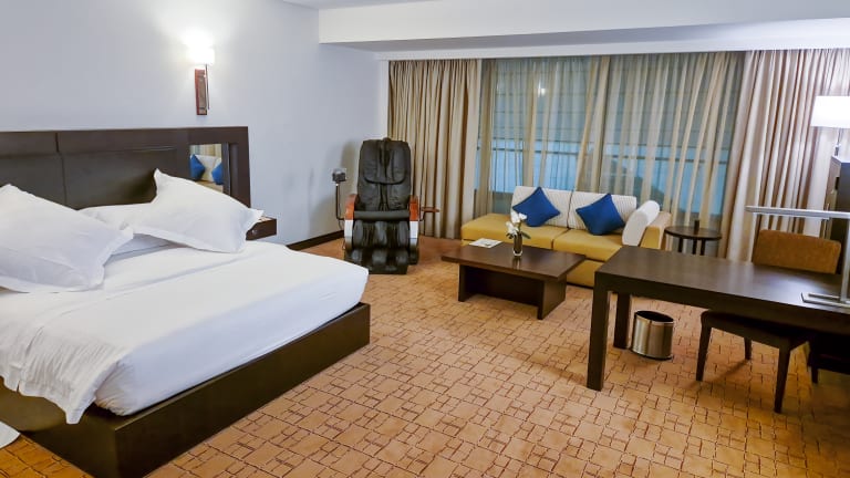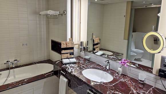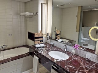 Die Zimmer sind mit einer Klimaanlage und Heizung ausgestattet und bieten ein Queensize-Bett sowie die Möglichkeit, Zustellbetten anzufordern. Zur Ausstattung gehören ein Safe, eine Minibar, ein Schreibtisch und ein Kühlschrank. Auch eine Tee-/Kaffeemaschine sowie ein Bügelset und eine Hosenpresse sind vorhanden. Das Zimmer bietet weiterhin ein TV-Gerät, einen Wecker sowie gratis Wifi. Die Badezimmer sind mit Dusche, Badewanne und Bidet ausgestattet und bieten Bademäntel, Haartrockner und Kosmetikartikel.