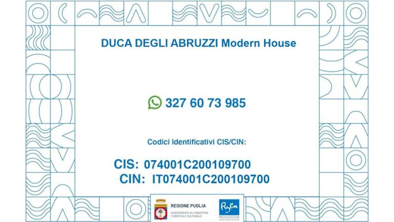 Die Unterkunft DUCA DEGLI ABRUZZI Modern House befindet sich in Brindisi, nahe dem Flughafen und bietet Meerblick. In der Umgebung haben Gäste die Möglichkeit zu angeln und Velo zu fahren. Das Naturreservat Torre Guaceto liegt in einer akzeptablen Entfernung von 16 km.