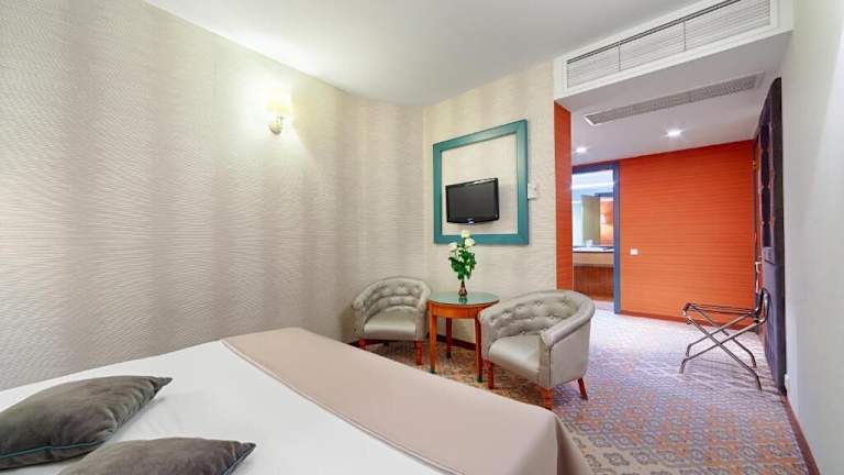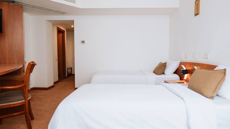 Die Zimmer sind mit Klimaanlage, Heizung und Ventilator ausgestattet. Jedes Zimmer verfügt über ein Doppelbett und ein Sofabett. Zustellbetten können angefordert werden. Zur weiteren Ausstattung gehören ein Safe, eine Minibar, ein Schreibtisch sowie eine Tee- und Kaffeemaschine. Die Badezimmer sind mit Dusche und Badewanne ausgestattet und beinhalten Pflegeprodukte, Bademäntel sowie einen Haartrockner. Familien- und Nichtraucherzimmer stehen zur Verfügung.