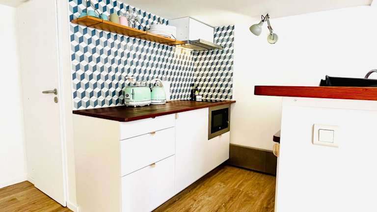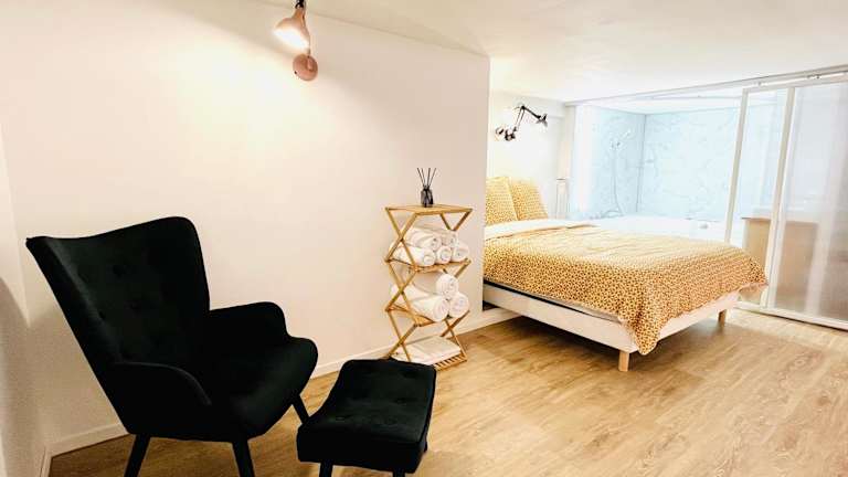 Die Ferienwohnung umfasst ein Schlafzimmer, ein Wohnzimmer und eine voll ausgestattete Küche mit Kühlschrank und Kaffeemaschine. Im Badezimmer sind ein Bidet und ein Whirlpool vorhanden. Die Unterkunft stellt Bettwäsche und Handtücher zur Verfügung.