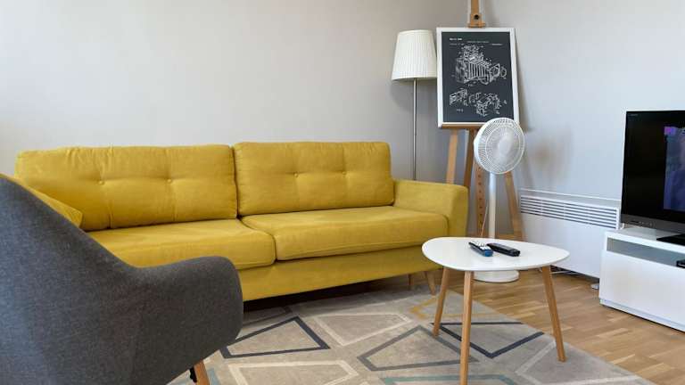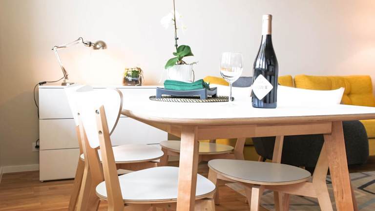 Die Ferienwohnung umfasst ein Wohnzimmer, einen Essbereich, ein Schlafzimmer sowie ein Badezimmer mit Dusche. Eine Küchenzeile ist mit Kühlschrank, Geschirrspüler und Ofen ausgestattet. Handtücher und Bettwäsche werden gestellt. Die Unterkunft bietet zudem einen WLAN-Zugang.