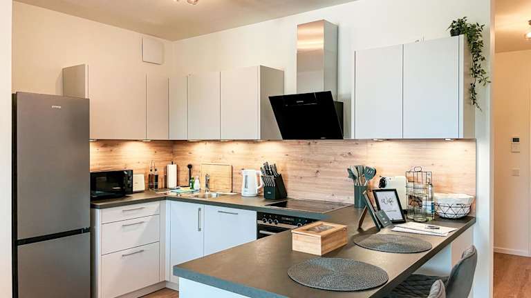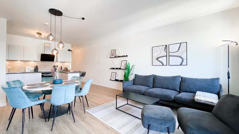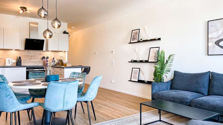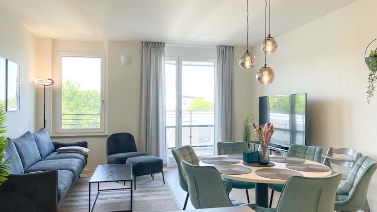 E&K living - 6 pers - design apartment - fair - congress - parking bietet einen Blick auf den Garten und umfasst eine Ferienwohnung, die mit zwei Schlafzimmern und zwei Badezimmern ausgestattet ist. Gäste finden auch eine Gemeinschaftslounge vor. Die Unterkunft überzeugt durch eine ruhige Lage und gute Erreichbarkeit.