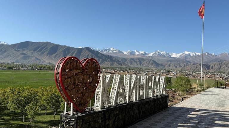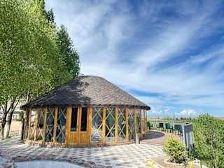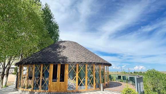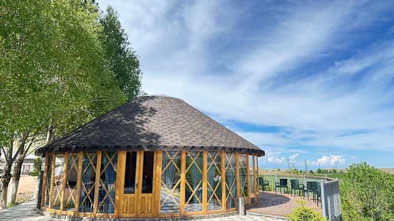 Die Unterkunft Eco Resort Kaiyrma befindet sich in Bokonbayevo mit Blick auf die Stadt und ist von einem Garten mit einer einladenden Terrasse umgeben.