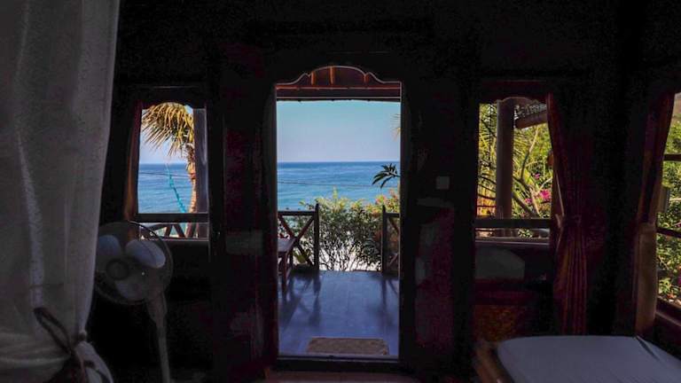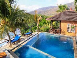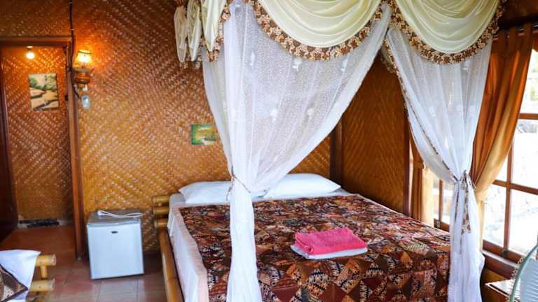 Die gemütlichen Eka Purnama Cottages bieten einen Panoramablick auf die Balisee und die umliegenden Berge. Die Unterkünfte sind mit Bambus- und geschnitzten Holzmöbeln eingerichtet und verfügen über private Terrassen mit Aussicht auf die tropische Umgebung.