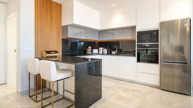Die Unterkunft besteht aus zwei Schlafzimmern und einem Wohnzimmer. Weiterhin ist eine voll ausgestattete Küche mit Kühlschrank, Wasserkocher und Kaffeemaschine sowie zwei Badezimmer mit Dusche und Haartrockner vorhanden. Handtücher und Bettwäsche werden zur Verfügung gestellt.
