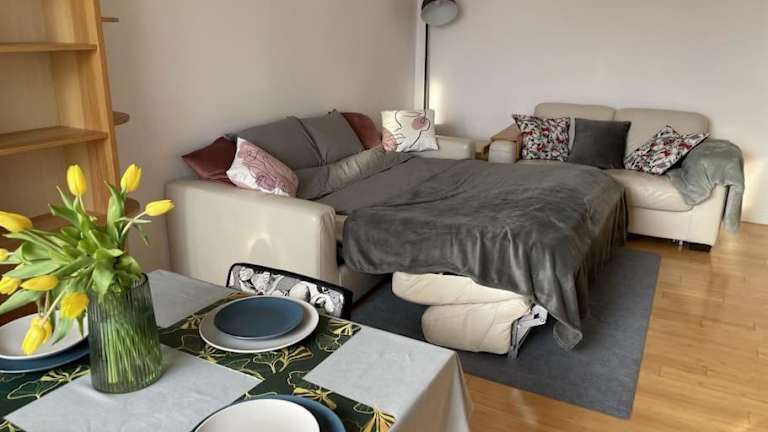 Die Ferienwohnung ist ausgestattet mit einem Schlafzimmer, einer Küche mit Kühlschrank und Geschirrspüler, einem Flachbild-TV, einem Sitzbereich und einem Badezimmer mit Dusche. Handtücher und Bettwäsche werden bereitgestellt. Ein Balkon ergänzt die Ausstattung.