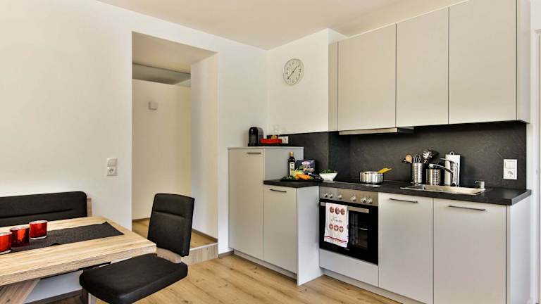 Die Ferienwohnung umfasst ein Schlafzimmer, ein Wohnzimmer sowie eine gut ausgestattete Küche mit Kühlschrank und Geschirrspüler. Ein eigenes Badezimmer mit Dusche ist ebenfalls vorhanden. Handtücher und Bettwäsche werden zur Verfügung gestellt.