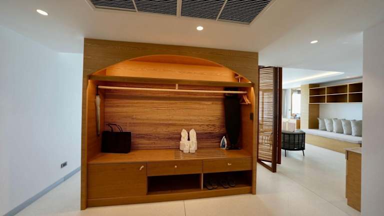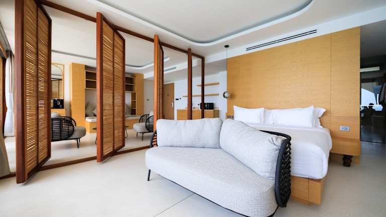 Die klimatisierten Zimmer sind mit einem Schreibtisch, einer Kaffeemaschine, einem Kühlschrank, einer Minibar, einem Safe und einem Flachbild-TV ausgestattet. Zudem verfügen die Zimmer über eine Terrasse und ein eigenes Badezimmer mit einem Whirlpool. Ein Kleiderschrank und ein Wasserkocher stehen ebenfalls zur Verfügung.