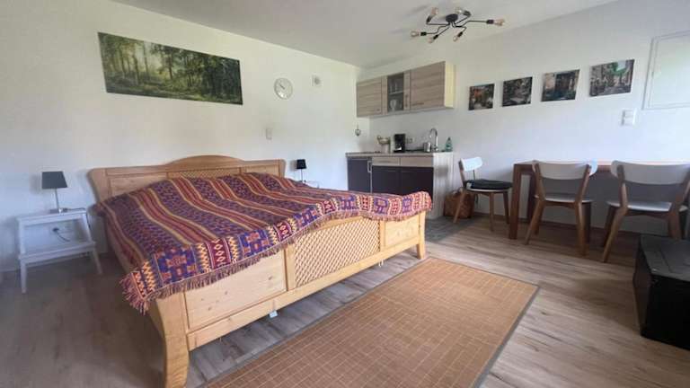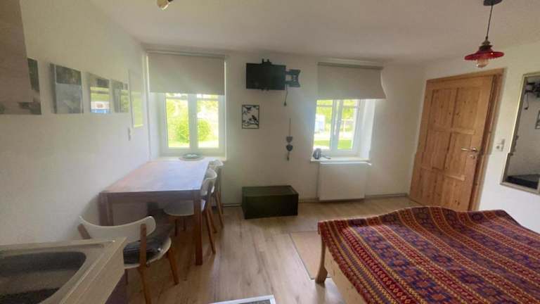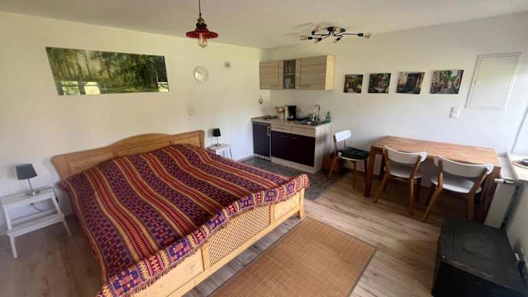 Die Ferienwohnung umfasst ein Schlafzimmer und ist ausgestattet mit einem Flachbild-TV, einem Sitzbereich sowie einem Badezimmer mit Dusche. Die Küchenzeile bietet alle notwendigen Annehmlichkeiten für einen kurzen oder längeren Aufenthalt.