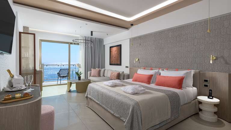 Deluxe-Zimmer (Meerblick / ca.: 30 qm*. Max. Belegung: 3 Erwachsene oder 2 Erwachsene und 1 Kind): Zimmer mit gehobener Ästhetik und modernem Design, ausgestattet mit Wenge- und Zebrano-Möbeln. Das Deluxe-Zimmer ist mit zwei Einzelbetten oder einem Queen-Size-Bett, Fliesen- oder Teppichboden, Wohnbereich sowie mit einem 8 qm großen, vollmöblierten Balkon ausgestattet. Das Badezimmer ist mit schokoladefarbenen Gestaltungselementen veredelt und mit Badewanne, Haartrockner, Vergrößerungsspiegel, Telefon sowie zahlreichen Luxus-Pflegeprodukten ausgestattet. Premium Gästezimmer (Meerblick / ca.: 30 qm*. Max. Belegung: 2 Erwachsene und 1 Kind): Neu gestaltet, mit einem geräumigen und modernen Design, akzentuiert durch eine beruhigende Farbpalette, erstreckt sich das Premium Deluxe Gästezimmer über 30 Quadratmeter. Es verbindet gekonnt Eleganz mit Komfort und ist entweder mit einem Queensize-Doppelbett oder zwei Einzelbetten verfügbar. Dieses stilvolle Gästezimmer befindet sich in den Gebäuden Eos und Helios, ist mit exquisiten Möbeln ausgestattet und verfügt über eine Sitzecke mit Sofa und Schreibtisch. Das geräumige Badezimmer verfügt über eine begehbare Regendusche und luxuriöse Pflegeprodukte sowie eine großzügige Auswahl an erstklassigen Annehmlichkeiten. Abgerundet wird das Gesamterlebnis durch den zusätzlichen 8 Quadratmeter großen möblierten Balkon, der einen unvergleichlichen Panoramablick auf die Ägäis und atemberaubende Sonnenaufgangserlebnisse bietet. Superior Deluxe-Zimmer (Meerblick / ca.: 30 qm*. Max. Belegung: 2 Erwachsene): Zimmer mit gehobener Ästhetik und modernem Design, ausgestattet mit Wenge-Möbeln. Das Superior Deluxe Zimmer ist mit zwei Einzelbetten oder einem Queen-Size-Bett, Fliesen- oder Teppichboden, Wohnbereich sowie mit einem 8 qm großen, bequem möblierten Balkon ausgestattet. In allen Badezimmern können die Gäste in der Hydromassage-Badewanne entspannen und dabei durch die Glaswand den Blick aufs Meer genießen; die Badezimmer sind zudem mit Haartrockner, Vergrößerungsspiegel, Telefon und zahlreichen Luxus-Pflegeprodukten ausgestattet. Luxus Suite mit einem Schlafzimmer (Meerblick / ca.: 64 qm*. Max. Belegung: 2 Erwachsene und 2 Kinder): Diese luxuriöse Suite im modernem Design besteht aus einem Schlafzimmer und einem großen Wohnzimmer mit eigenem Essbereich. Das Schlafzimmer ist mit Holzfußboden sowie King-Size-Bett, begehbarem Schrank, privatem Badezimmer mit Duschkabine, Hydromassage-Badewanne, zwei Waschbäcken, Haartrockner, beleuchtetem Vergrößerungsspiegel, Telefon und separatem WC ausgestattet. Das komfortable Wohnzimmer führt zu einen geräumigen, 16 qm großen Balkon, der mit seinen erholsamen Lehnstühlen ausgestattet ist und den Gästen einen herrlichen Blick auf das Ägäische Meer bietet. Elite-Zimmer (Meerblick / ca.: 30 qm*. Max. Belegung: 2 Erwachsene): Zimmer mit gehobener Ästhetik und modernem Design, ausgestattet mit Wenge- oder Zebrano-Möbeln und Holzfußboden. Das Elite-Zimmer ist entweder mit zwei Einzelbetten oder einem Queen-Size-Bett, einem Wohnbereich und einem 8 qm großen, bequem möblierten Balkon ausgestattet. Das Badezimmer ist mit Hydromassage-Badewanne, Haartrockner, beleuchtetem Vergrößerungsspiegel, Telefon und einer Vielzahl von Luxus-Pflegeprodukten ausgestattet. Elite Superior-Zimmer (Meerblick / ca.: 36 qm*. Max. Belegung: 2 Erwachsene und 1 Kind): Dieses komfortable luxuriöse Zimmer ist lichtdurchflutet und bietet einen spektakulären Blick auf die Ägäis sowie einen überwältigenden Sonnenaufgang. Das Elite Superior-Zimmer bietet denselben Komfort wie das Elite-Zimmer, ist jedoch mit einem größeren Sofa, einem geräumigeren Sitzbereich mit Schreibtisch und einem Badezimmer mit separatem WC ausgestattet. Einige Zimmer sind zudem mit einer Glaswand ausgestattet (nach Verfügbarkeit). Hier können die Gäste während ihrer Hydromassage in der Badewanne den einzigartigen Blick auf die Ägäis genießen. Elite Junior Suite (Meerblick / ca.: 48 bis 55qm*. Max. Belegung: 2 Erwachsene und 2 Kinder nach Verfügbarkeit): Diese geräumige Suite mit gehobener Ästhetik und Design ist mit einem Queen-Size-Bett, Wenge- oder Zebrano-Möbeln und Holzfußboden verfügbar. Außerdem ist sie mit einem Schreibtisch, einem großen separaten Wohnbereich, geräumigem Balkon mit Meeresblick und zwei Badezimmern mit Markenpflegeprodukten ausgestattet, wovon eines mit Hydromassage-Badewanne, zwei Waschbäcken, separatem WC, Haartrockner, beleuchteten Vergrößerungsspiegel, Telefon und das Zweite mit Duschkabine, zwei Waschtischen und WC ausgestattet sind. Elite Luxus Suite mit einem Schlafzimmer (Meerblick / ca.: 62 qm*. Max. Belegung: 2 Erwachsene und 1 Kind): Diese einzigartige und luxuriöse Suite in modernem Design, mit Holzfußboden und Wenge-Möbeln bietet von jedem Punkt des Zimmers einen atemberaubenden Panorama-Meeresblick. Das Schlafzimmer ist mit King-Size-Bett, zwei Kleiderschränken, einem Schreibtisch und einem Badezimmer mit Duschkabine, Hydromassage-Badewanne, zwei Waschbäcken, Haartrockner, beleuchtetem Vergrößerungsspiegel, Telefon und separatem WC ausgestattet. Das geschmackvolle Wohnzimmer mit Essbereich bietet den Gästen einen Panorama-Meeresblick und die Möglichkeit, durch die große Glaswand auf das offene Meer zu schauen. Der geräumige, 16 qm große Balkon ist mit bequemen Lehnstühlen ausgestattet, in denen die Gäste entspannen und den herrlichen Blick auf die Ägäis genießen können. Präsidenten-Suite (Meerblick / ca.: 115 qm*. Max. Belegung: 4 Erwachsene oder 2 Erwachsene und 2 Kinder): Diese ultra-luxuriösen Suiten sind mit weißer oder grauer Innenausstattung sowie mit einem Master-Schlafzimmer, einem zweiten Schlafzimmer und einem großen Wohnbereich ausgestattet. Das Master-Schlafzimmer mit Parkettboden ist mit einem King-Size-Bett, Ein Suite-Whirlpool-Badezimmer mit Blick auf die Ägäis, begehbarer Jaccuzi-Dusche, zwei Waschtischen und einem separaten WC 