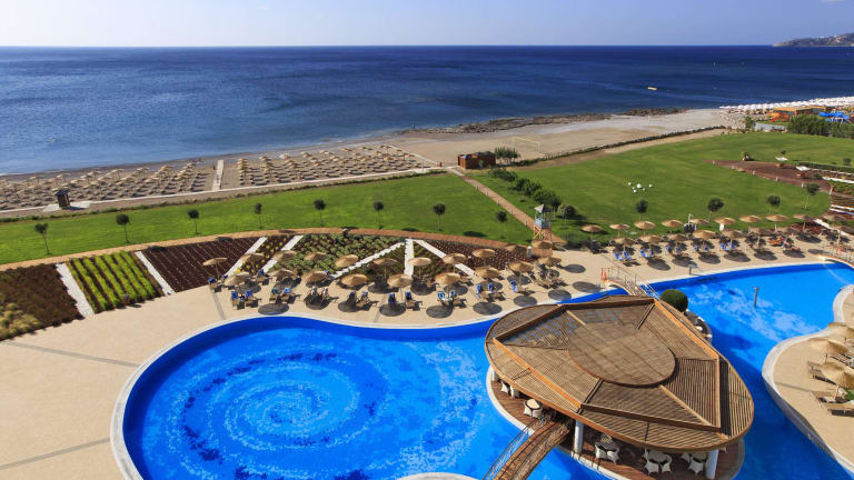 Serenity Spa: Topmodernes Spa auf 800 qm mit den weltweit renommierten ESPA-Behandlungen und -Produkten, mit Rezeptionsbereich, 13 separaten Behandlungsräumen, Yoga & Pilates Studio, einen Entspannungsraum und Außenpool mit Hydromassage. Das Spa bietet eine breite Auswahl an charakteristischen ESPA-Ritualen und Körperbehandlungen und legt den Schwerpunkt auf Stress- und Spannungsabbau bei gleichzeitiger Stärkung der inneren Balance und Harmonie. Alle Gäste, die sich im Spa behandeln lassen, kommen in den Genuss von modernen Spa-Anlagen, zu denen die luxuriösen Hitzebehandlungsanwendungen und der Hydromassage-Außenpool gehören. Sport: Fitnessstudio mit Cybex-Geräten; schneller Tennisplatz mit Flutlichtanlage; Fitnessaktivitäten einschl. Yoga, Pilates und Aqua-Gymnastik; Minigolf, Boccia-Platz, Beach-Volleyball und naheliegende Wassersportstation (wird von einem unabhängigen Unternehmen betrieben). Ein 18-Loch-Golfplatz (Afandou) ist 8 km entfernt. Pools: Zwei Außenpools: Pool im Lagunenstil (1610 qm) und ein zweiter kleinerer Kinder-Außenpool sowie ein Hydromassage-Pool (140 qm), der den Spa-Gästen exklusiv zur Verfügung steht. Alle Pools werden mit Süßwasser betrieben. Strand: 400 m langer Sand- und Kiesstrand, direkt vor dem Hotel. Liegestühle & Sonnenschirme sowohl an den Pools als auch am Strand; Strandtücher sind für Hotelgäste kostenlos erhältlich (gegen Pfand). Unterhaltung: Live Klaviermusik in der Crystal Lounge Bar und im Noble Gourmet Restaurant. Abendliche Unterhaltungs-Shows und verschiedene Nachtthemen werden zwischen Juni und September täglich angeboten (in der Vor- und Nachsaison abhängig vom Wetter). Shopping: Auf der Hotelanlage finden Sie einen Minimarkt, einen Souvenirladen und eine Autovermietung.