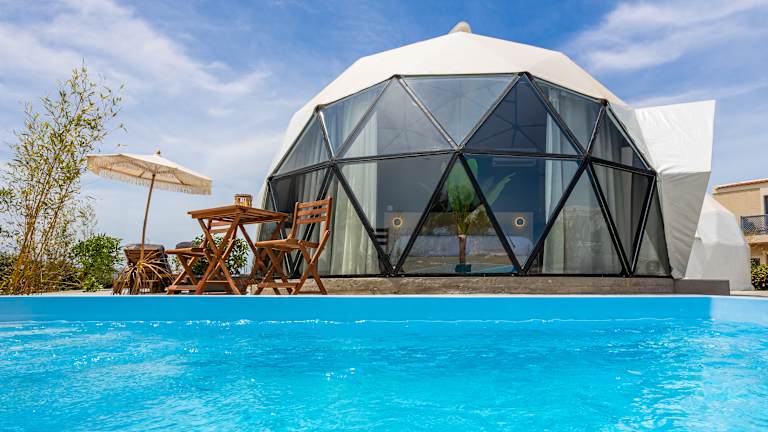 The Domes layout offers a lot of privacy. Each one will be 28 sqm, with a built private bathroom with shower, air conditioning, flat-screen TV, fridge, coffee and tea facilities. They will be equipped with UVB glass, totally soundproofed, with constant inside temperature of 24 degrees Celsius, even without the use of A/C and an outdoor private pool.