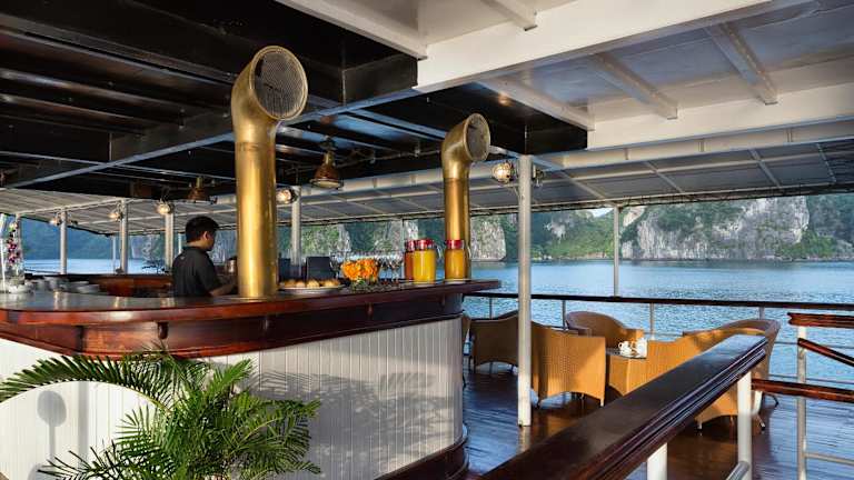 Im Speisesaal des Bootes wird Vollpension serviert, inklusive vietnamesischer und internationaler Buffetgerichte. Die Bar bietet eine Auswahl an Bier, Cocktails, Wein und anderen Getränken.