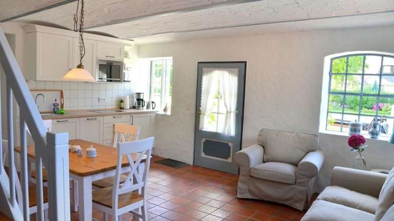 Die Küchenzeile der Ferienwohnung ist ausgestattet mit einem Kühlschrank, Geschirrspüler, Mikrowelle, Kaffeemaschine und Wasserkocher, sodass Gäste ihre Mahlzeiten selbst zubereiten können.