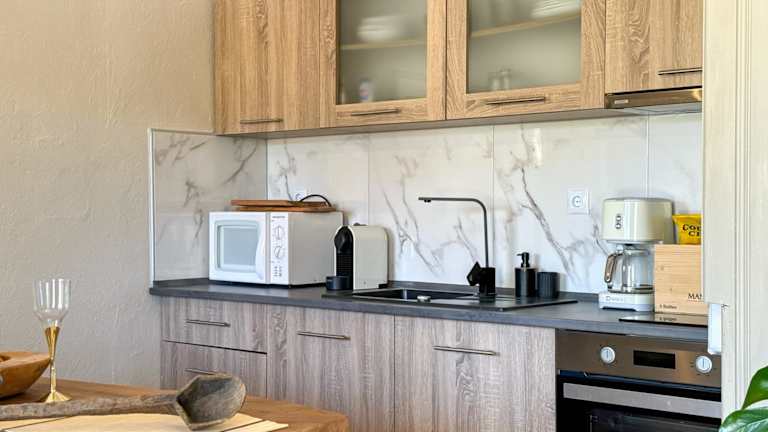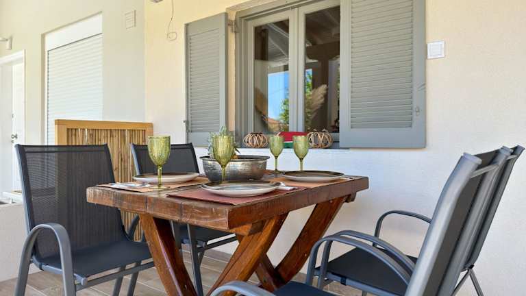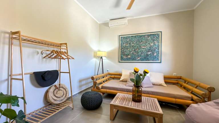 Die Villa mit Klimaanlage umfasst ein Schlafzimmer, ein Wohnzimmer und eine voll ausgestattete Küche mit Kühlschrank und Kaffeemaschine. Zudem verfügt sie über ein Badezimmer mit Dusche und kostenlosen Pflegeprodukten. Handtücher und Bettwäsche werden bereitgestellt. Es gibt eine Sonnenterrasse mit Sonnenstühlen/-liegen und Gartenmöbeln.