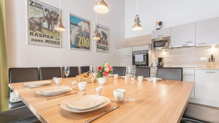 Die Ferienwohnung umfasst 3 Schlafzimmer, ein Wohnzimmer und eine voll ausgestattete Küche mit Kühlschrank und Kaffeemaschine. Es sind 3 Badezimmer mit Duschen vorhanden. Handtücher und Bettwäsche werden bereitgestellt, sodass sich die Gäste um nichts kümmern müssen.