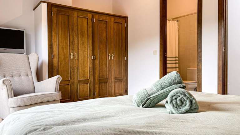 Das Ferienhaus umfasst 3 Schlafzimmer und 2 Badezimmer. Zur Ausstattung gehören Bettwäsche, Handtücher, ein Flachbild-TV, ein Essbereich, eine voll ausgestattete Küche sowie eine Terrasse mit Aussicht auf die Berge.