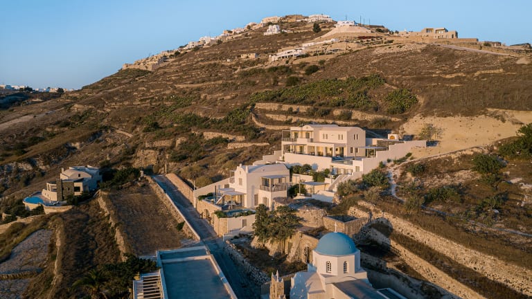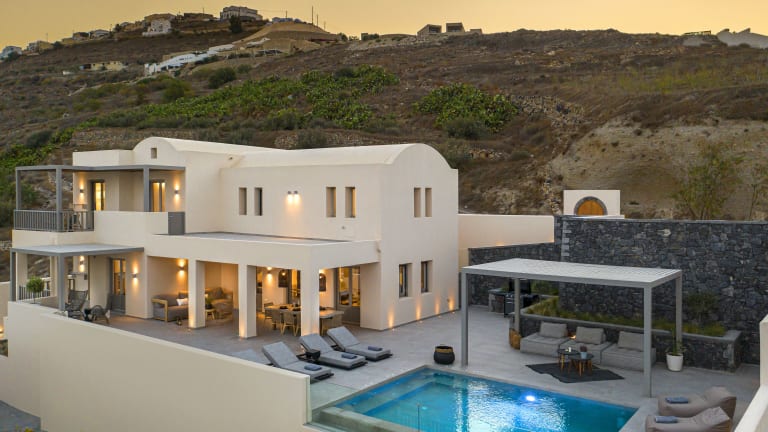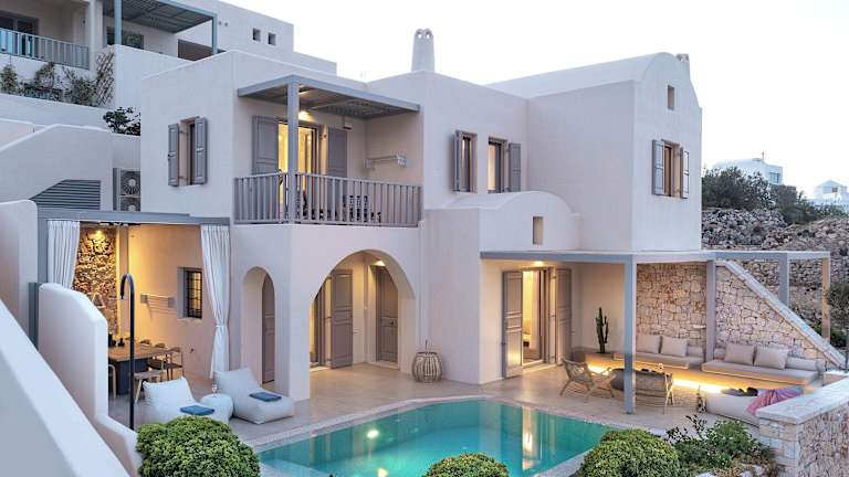 Die Eolia Villas befinden sich in einer ruhigen Lage im Dorf Exo Gonia, nur 4,5 km vom Flughafen Santorini entfernt. Das Dorf Pirgos liegt 2 km entfernt und die lebhafte Stadt Fira erreichen Sie nach 7 km. Der Hafen Athinios ist 6,5 km entfernt.