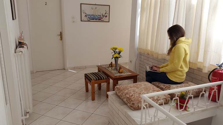 Es wird die Möglichkeit gegeben, Essenslieferungen in die Unterkunft zu empfangen. Eine Gemeinschaftsküche steht den Gästen zur Verfügung, jedoch sind keine weiteren Verpflegungsangebote beschrieben.