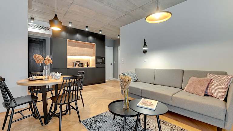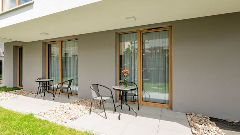 Die Apartments sind mit einem Balkon, einem Sitzbereich, einem Satelliten-Flachbild-TV sowie einer voll ausgestatteten Küche ausgestattet. Diese verfügt über einen Kühlschrank, Geschirrspüler, Mikrowelle, Herdplatte, Toaster und Wasserkocher. Jedes Apartment bietet zudem ein eigenes Badezimmer mit Dusche und kostenlosen Pflegeprodukten.