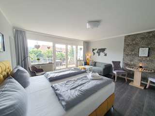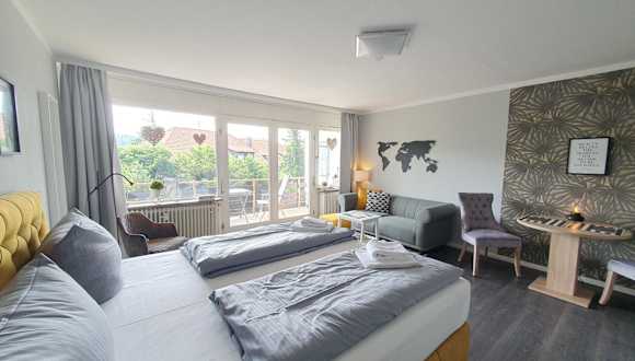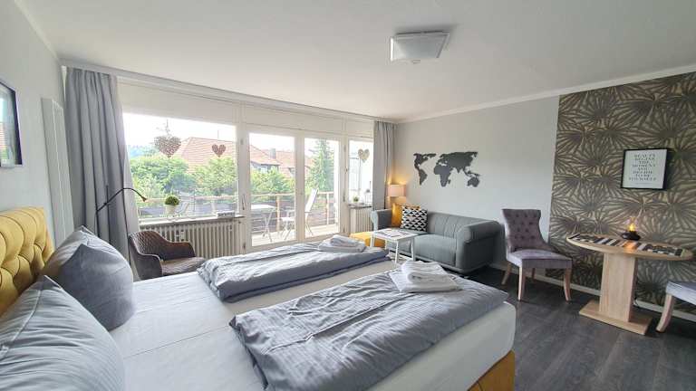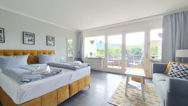 Das Erholung Pur Apartment bietet modernen Komfort und Geräumigkeit. Der Wohnbereich ist mit einem Flachbild-TV und einem hochwertigen Sofa ausgestattet. Vom Balkon aus können Sie eine herrliche Aussicht auf den Bocksberg genießen. Die Küche verfügt über ein Ceran-Kochfeld und einen Backofen, so dass Sie Ihre eigenen Mahlzeiten zubereiten können. Das Badezimmer ist modern gestaltet und verfügt über eine extra große Dusche.