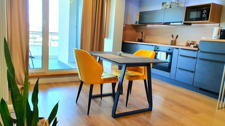 Die Ferienwohnung verfügt über 1 Schlafzimmer, 1 Badezimmer, Bettwäsche, Handtücher, einen Flachbild-TV mit Satellitenkanälen, einen Essbereich, eine voll ausgestattete Küche und eine Terrasse mit Stadtblick. Handtücher und Bettwäsche können auf Anfrage gegen Aufpreis zur Verfügung gestellt werden.