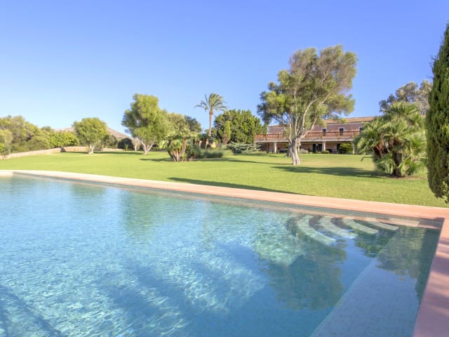 Beeindruckendes Herrenhaus auf dem Land die die Bucht von Alcudia und das mallorquinische Gebirge beherrscht. Groβartigkeit und Eleganz des traditionellen Baustils verbinden sich mit zeitgemäβem Komfort, wie Heizung, Klimaanlage und W-Lan. Mit Sorgfalt und erlesenem Geschmack eingerichtet. Das Herrenhaus verfügt über eine Hauptwohnung und zwei angrenzende Appartments. - Die Hauptwohnung unterteilt sich in Erd- und Obergeschoss. · Im Erdgeschoss befinden sich die Einrichtungen für den Alltag zu Hause: Empfangshalle und –Dielen, Gäste-WC, drei Wohnzimmer, zwei Esszimmer, Küche, Speiserkammer, Waschraum… · Mehr Privatsphäre finden Sie im Obergeschoss: vier groβzügig gestaltete Schlafzimmer mit und ohne Terrasse und Badezimmer en Suite (zwei Doppelschlafzimmer und zwei Vierbettzimmer), zwei groβe Wohnzimmer und eine groβräumige Terrasse, von der aus Sie den Blick auf den herrlichen Garten, das Meer und die Berge genieβen können. - Das am Herrenhaus angebaute Appartment hat Wohnzimmer, zwei Doppelschlafzimmer mit jeweils einem Badezimmer en Suite. - Das zweite Appartment ist unabhängig und verfügt über ein Doppelschlafzimmer mit Badezimmer en Suite, ein kleines Wohnzimmer, Küche und Esszimmer. Die Gebäude befinden sich inmitten einer weitläufigen Gartenanlage mit Pool und typisch mediterraner Planzenvielfalt. Auf der Finca stehen den Gästen auch überdachte Parkmöglichkeiten (9 Plätze), eine Kapelle, Ställe mit Pferden und Ponys und sogar eine Trabrennbahn zur Verfügung.
