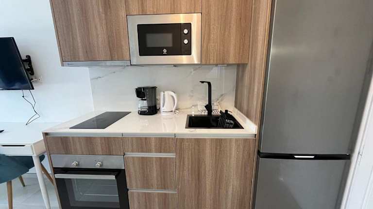Die eigene Küche ist ausgestattet mit einem Kühlschrank, Ofen, Mikrowelle, Kaffeemaschine und Wasserkocher, was eine Selbstverpflegung ermöglicht. Es sind Grillmöglichkeiten vorhanden.