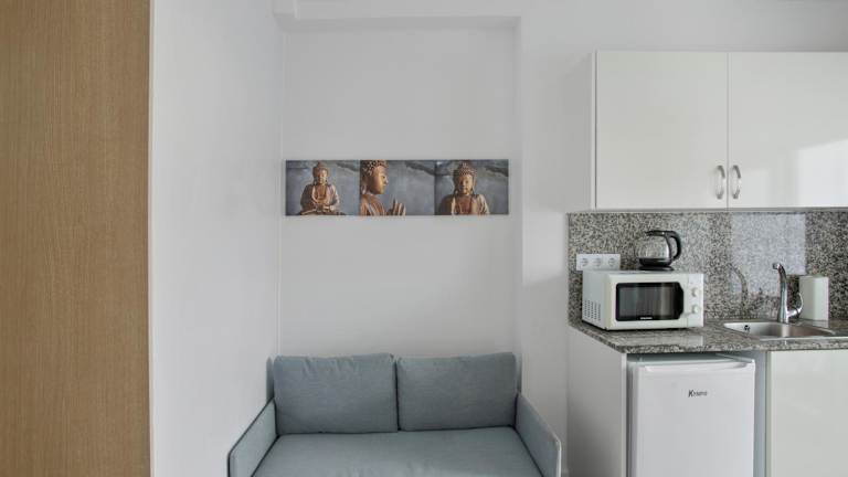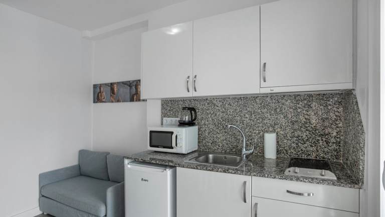 Die Ferienwohnung verfügt über eine eigene Küche, die eingerichtet ist mit einem Kühlschrank, einer Mikrowelle, einer Herdplatte, einer Kaffeemaschine und einem Wasserkocher. Es sind keine Verpflegungsmöglichkeiten im Hotel angegeben.