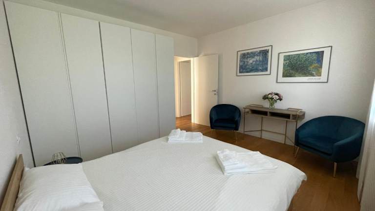 Die Ferienwohnung besteht aus drei Schlafzimmern, einem Wohnzimmer sowie einer voll ausgestatteten Küche, die mit einem Kühlschrank und einer Kaffeemaschine ausgestattet ist. Im Badezimmer befinden sich ein Bidet und eine Dusche. Handtücher und Bettwäsche werden bereitgestellt. Die Unterkunft verfügt über einen Balkon und ist klimatisiert.