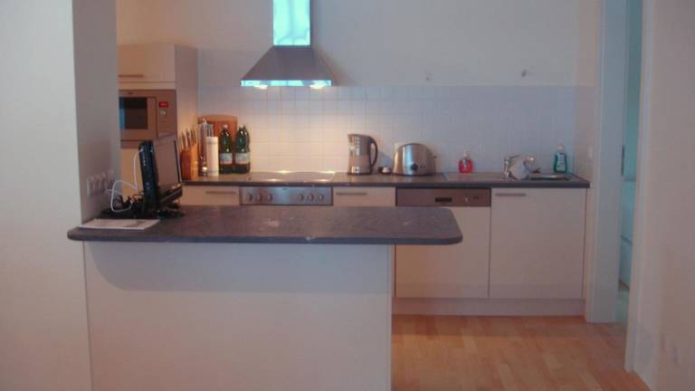 Die Ferienwohnung beinhaltet eine gut ausgestattete Küche, die mit einem Kühlschrank, einem Ofen und einer Mikrowelle ausgestattet ist.