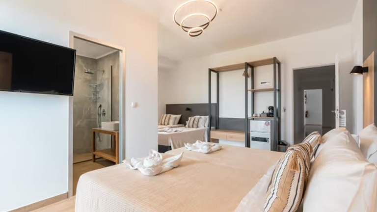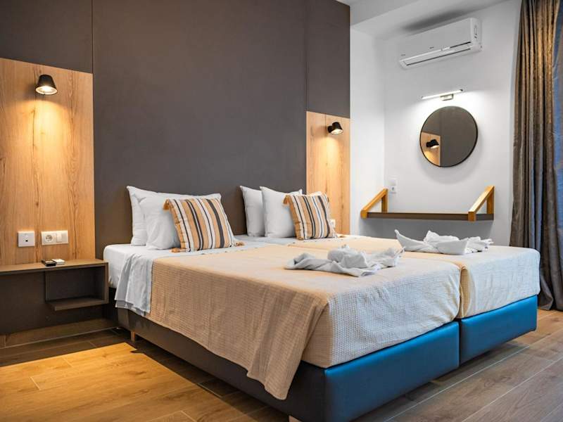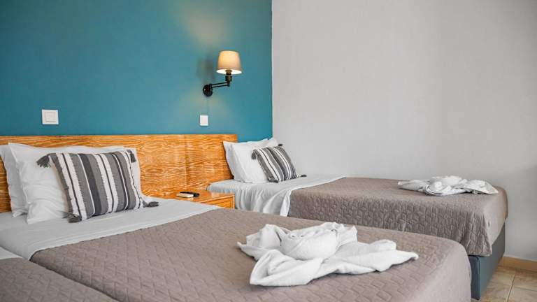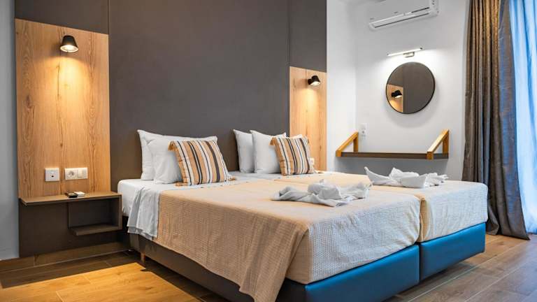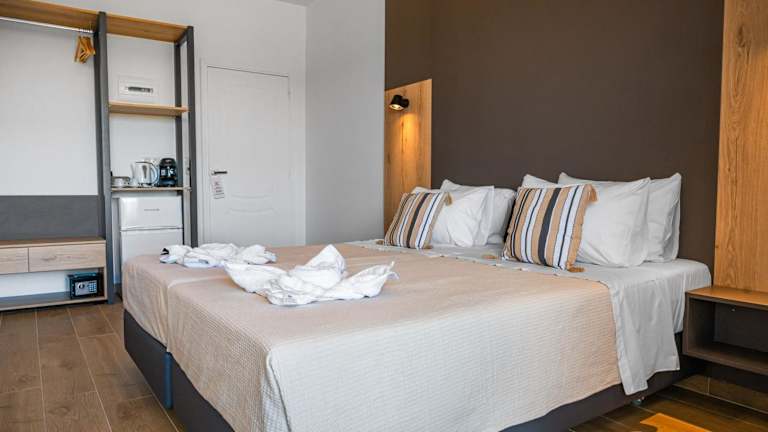 Die Zimmer sind mit Klimaanlage, einem Flachbild-TV mit Satellitenkanälen, einem Kühlschrank, einer Kaffeemaschine und einem eigenen Badezimmer ausgestattet, das mit einer Dusche und kostenlosen Pflegeprodukten versehen ist. Einige Zimmer bieten Meerblick und verfügen über einen Balkon. Die gängigen Zimmerausstattungen umfassen zudem ein Doppelbett oder ein Sofabett, einen Safe, eine Kochnische mit Mikrowelle sowie weiteres Zubehör wie Telefon, TV und Wifi. Im Badezimmer findet sich ein Haartrockner.