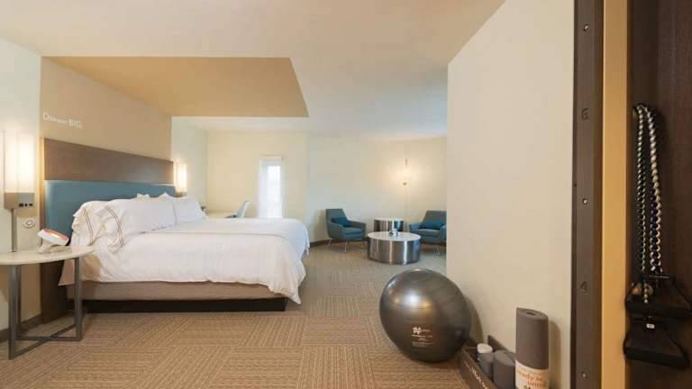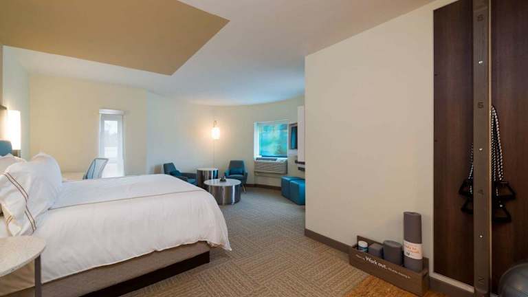 Modernes und sauberes Stadthotel, ca. 5min Laufweg von der Twinbrook Metro, ca.30min vom Stadtzentrum in DC. Das ganze Hotelkonzept dreht sich um Fitness und Gesundheit. Die Zimmer sind riesig, eher steril eingerichtet, aber sehr sauber. Für Fitnessfans gibt es im Zimmer eine eigene Trainingsstation mit Gesundheitsball, Yogamatte, Yogablock, Faszienrolle und verschiedenen Trainingsbändern. Passend dazu laufen im TV 10-20minütige Fitnessvideos zum mitmachen. Sportmuffel fühlen sich vielleicht eher unter Druck…