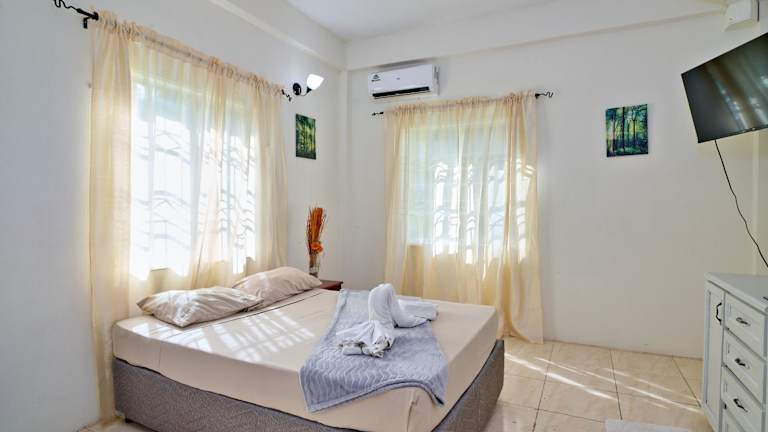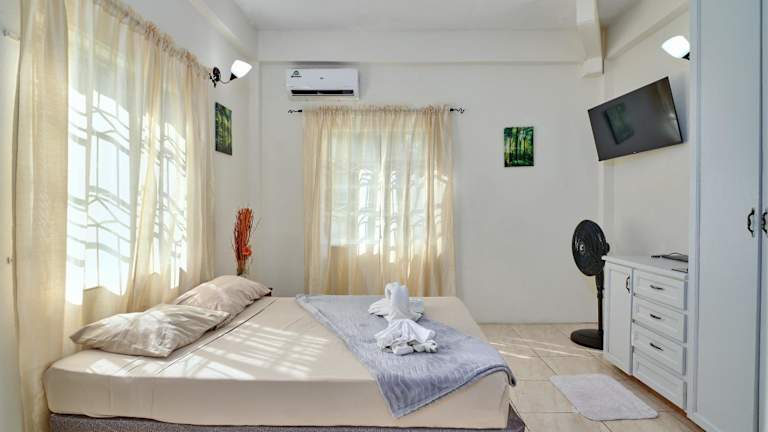 Die Ferienwohnung ist klimatisiert und umfasst ein Schlafzimmer sowie eine Küche mit Kühlschrank und Ofen. Zudem steht ein Flachbild-TV zur Verfügung. Handtücher und Bettwäsche können gegen Aufpreis bereitgestellt werden.