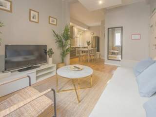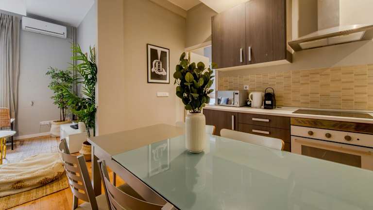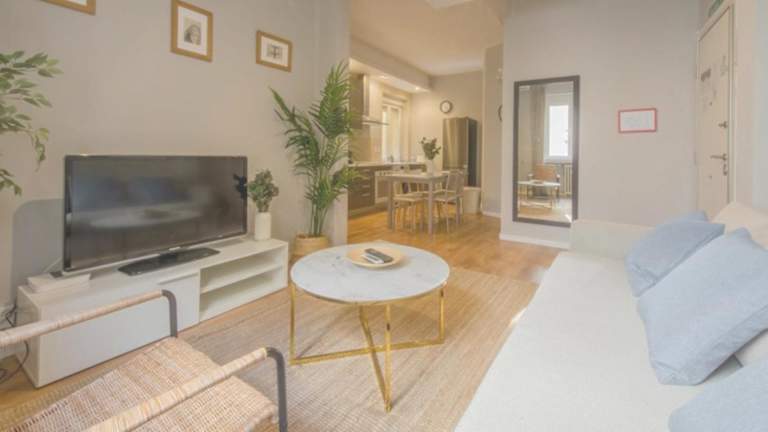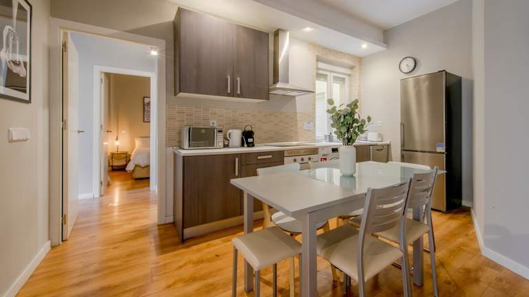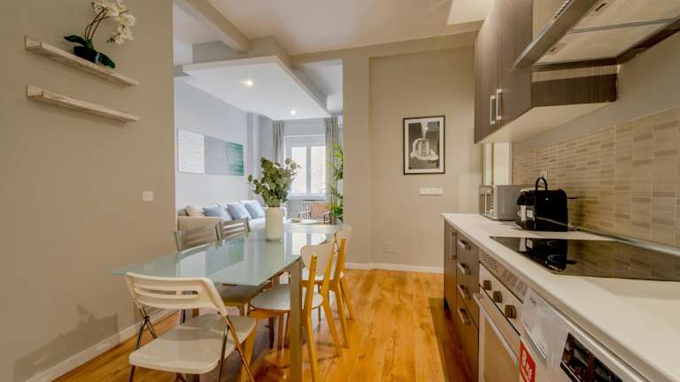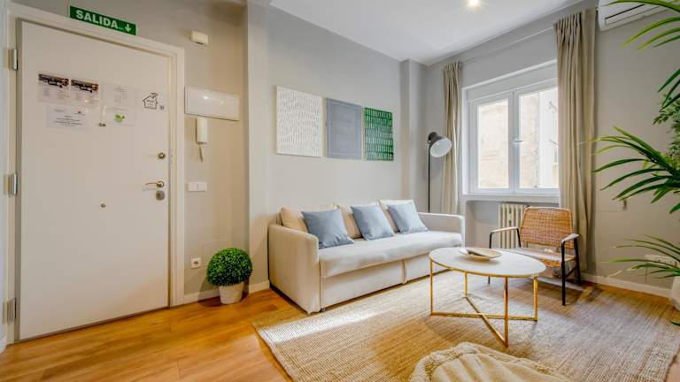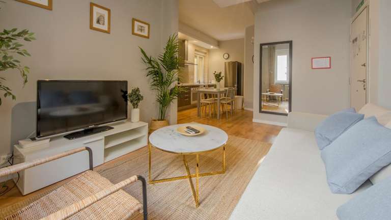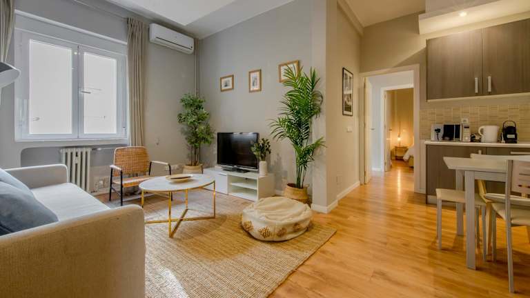 Es handelt sich um eine Ferienwohnung mit 3 Schlafzimmern, einem heimeligen Wohnzimmer und einer voll ausgestatteten Küche. Die Unterkunft bietet zudem einen Blick auf die Stadt und ermöglicht eine komfortable und entspannte Atmosphäre im Zentrum Madrids.