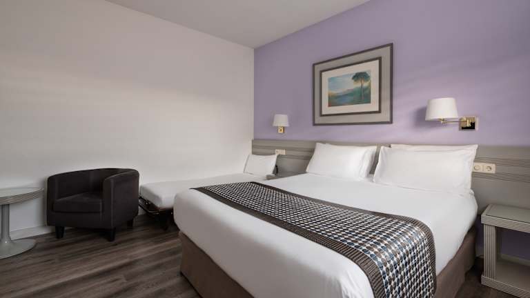 Die Zimmer sind mit Klimaanlage, Heizung, Teppichböden sowie einem Queensizebett und einem Sofabett ausgestattet. Zur Einrichtung gehören ein Safe, Minibar, Kühlschrank, TV-Gerät und kostenfreies Wifi. Die Badezimmer sind mit Dusche und Badewanne ausgestattet.