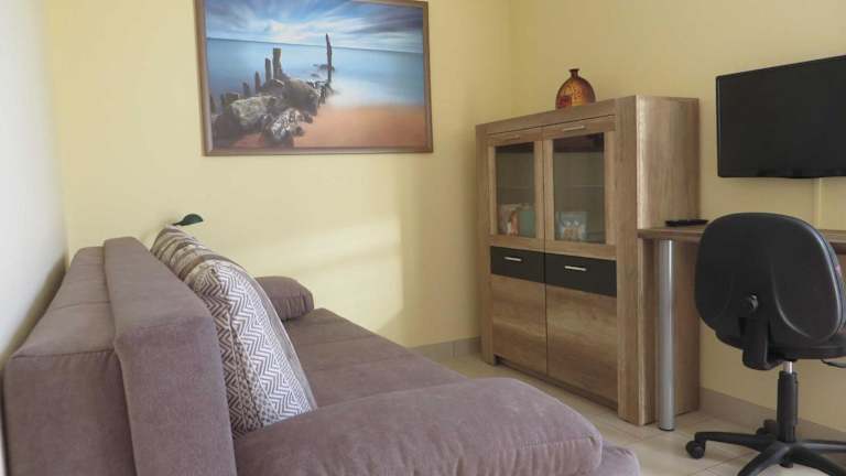 Die Ferienwohnung umfasst zwei Schlafzimmer und einen Balkon mit Meerblick. Auf Wunsch sind Handtücher und Bettwäsche gegen Aufpreis erhältlich. Allergikerfreundliche Zimmer sind zudem verfügbar.