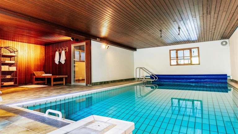 Die Unterkunft bietet zahlreiche Freizeitmöglichkeiten, darunter einen Innenpool und eine Sauna. Zusätzlich gibt es eine Sonnenterrasse sowie Gartenmöbel, die zum Entspannen im Freien einladen.