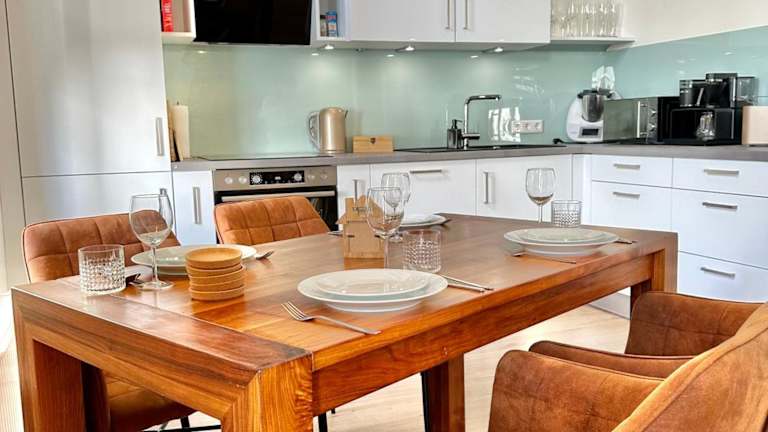 Die Ferienwohnung verfügt über ein gemütliches Wohnzimmer mit einem Flachbild-TV, eine gut ausgestattete Küche mit Kühlschrank und Geschirrspüler sowie ein Badezimmer mit Dusche. Es gibt zwei Schlafzimmer und eine Terrasse mit Blick auf den Garten. Handtücher und Bettwäsche werden bereitgestellt.