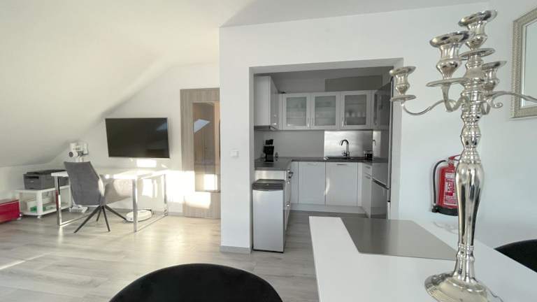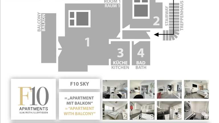 F10 APARTMENT Illertissen SKY ist eine Ferienwohnung im 3. Obergeschoss mit modernen Annehmlichkeiten für einen angenehmen Aufenthalt. Die Unterkunft ist familienfreundlich und nicht rauchbar, bietet kostenlose Parkiermöglichkeiten, sowie kostenloses Wifi und Sicherheitseinrichtungen wie Videoüberwachung und Rauchmelder.